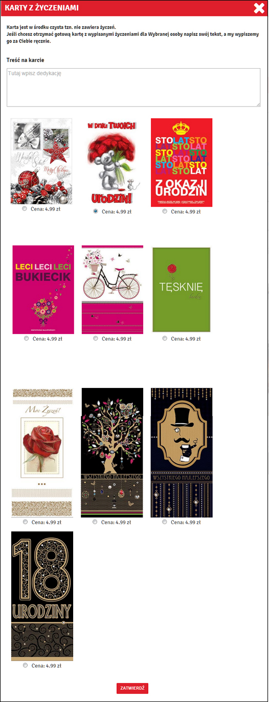 Do zakupionego upominku proponujemy możliwość zakupu kartki z życzeniami. Do wyboru 9 wzorów,